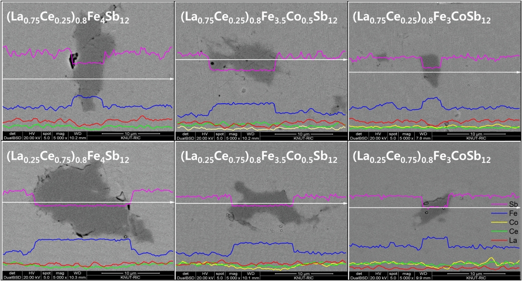 SEM images and EDS line scans of (La1-zCez)0.8Fe4-xCoxSb12 are shown in Fig 2. All of the specimens consisted of skutterudite phase (bright region) and marcasite