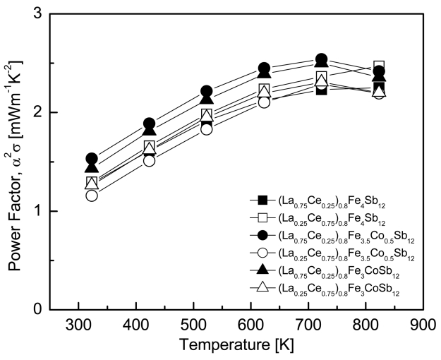 the power factor ranged from 2.25 to 2.53 mW m-1 K-2 at 723‒823 K, and (La0.75Ce0.25)0.8 Fe3.5Co0.5Sb12 exhibited a maximum value of 2.53 mW m-1K-2 at 723 K. The fully filled La0.75Ce0.25Fe3.5Co0.5Sb12 achieved a maximum power factor of 2.79 mW m-1 K-2 at 723 K [22].