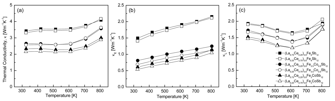 The thermal conductivity of (La1-zCez)0.8Fe4-xCoxSb12 is shown in Fig 6. Thermal conductivity (κ) consists of electronic thermal conductivity (κE) from the contribution of charge carriers, lattice thermal conductivity (κL) from