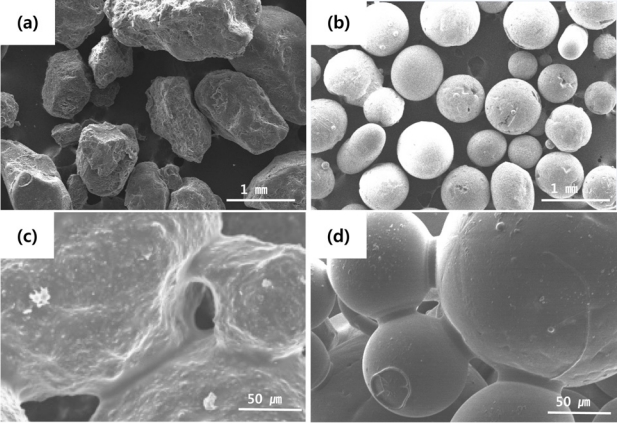 각진 형상이며, 인공주물사의 경우 구형임을 확인할 수 있다. 그림 2의 (c)와 (d)에서 확인할 수 있듯이 혼련사의 경우 무기바인더가 주물사 표면에 코팅되어 150 °C의 열에 의해 수분이 증발하여 모래와 모래 사이에