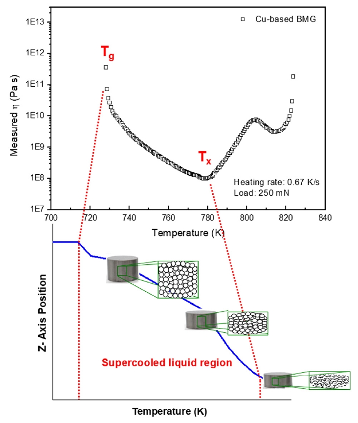 이용하여 방전플라즈마 소결시 과냉각 액상영역에서의 Z-position 변화 값을 측정하여 비정질 기지 복합재를 제조하였다. 그림 1에 나타낸 것과 같이 소결시 온도가 비정질 분말의 과냉각 액상영역의 시작 온도인 유리전이온도(Tg, glass transition temperature)에 도달하면 비정질 분말의 초소성 특성으로 인해 Z-position 값이 변화하게 되고, 온도가