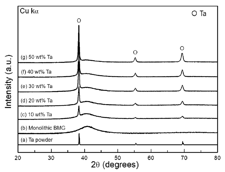 XRD traces of (a) Ta powder, (b) Cu54Ni6Zr22Ti18 BMG, and (c)~(g) Cu54Ni6Zr22Ti18 BMG composites containing Ta phase.