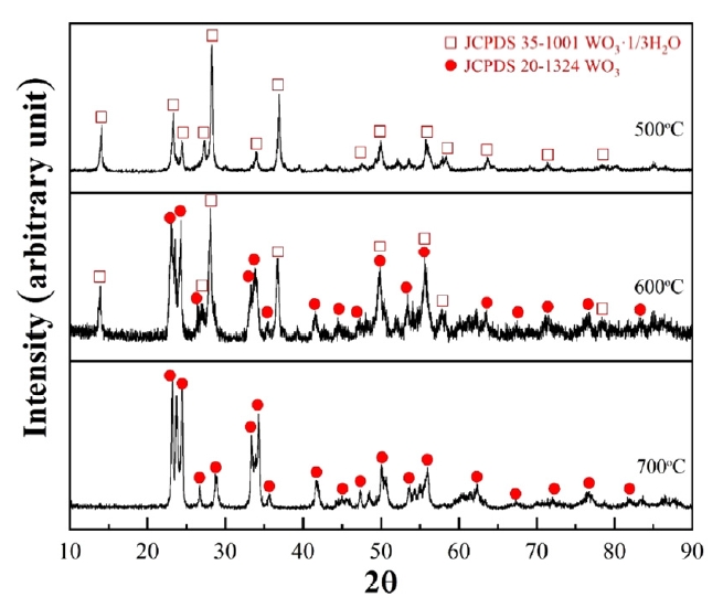 초음파 분무한 W 전구체의 열분해 온도에 따른 결정구조 변화를 확인하기 위해 관상로 내부의 온도를 각각 500, 600, 700 °C로 변화시켜 분말을