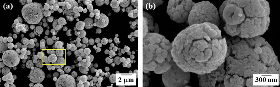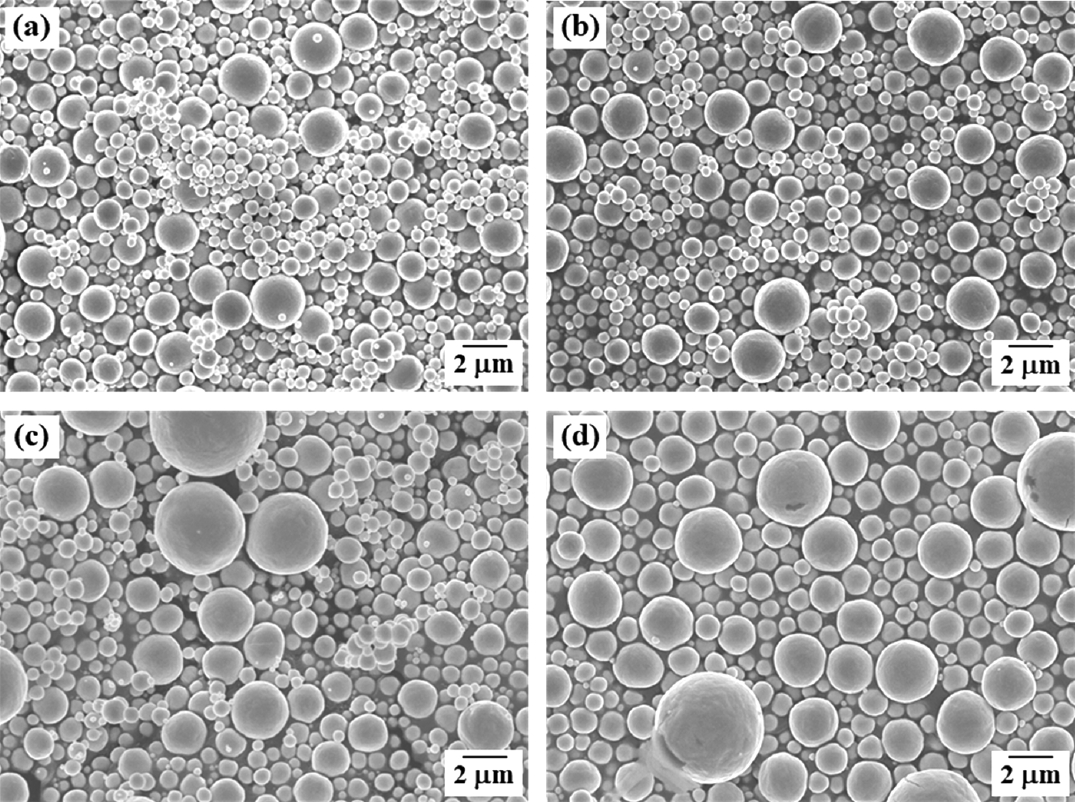관찰한 결과이다. 분말은 우수한 진구도를 가지는 구형이며 전구체 농도가 증가함에 따라 크기가 증가하는 경향을 보여준다. 정확한 분석을 위해 레이저