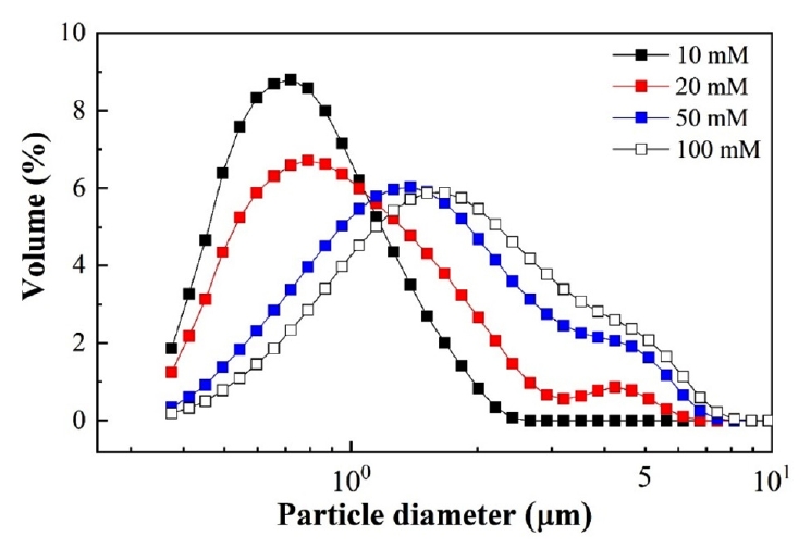 입도 분석기를 이용해 크기를 측정하여 그림 3에 나타내었다. 전구체의 농도가 10 mM인 경우 합성된 분말의 평균크기는 0.88 μm이며, 농도 증가에 따라 분말의 크기도 증가하여 100 mM의
