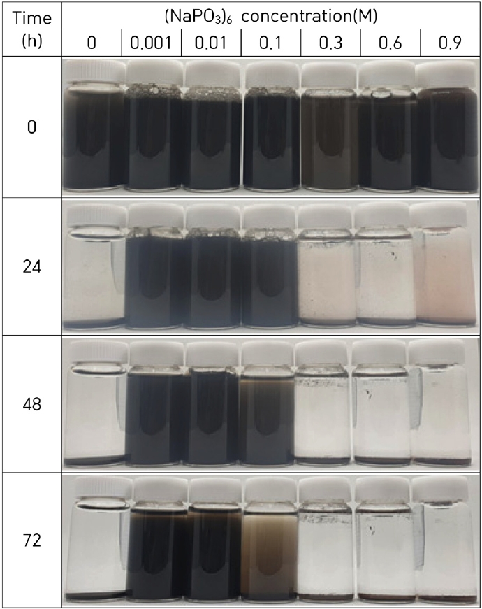그림 11에는 그림 10에 나타낸 (NaPO3)6의 몰 농도 변화에 따른 고로 슬러지의 분산을 24 시간 간격으로 관찰한 결과를 나타내었다. (NaPO3)6를 0.001~0.01 M의 첨가하였을 때 72 시간까지 슬러지 입자가 응집되지 않고 용액 속에 현탁되어 있었으며, 0.1M을 첨가하였을 경우 48시간부터
