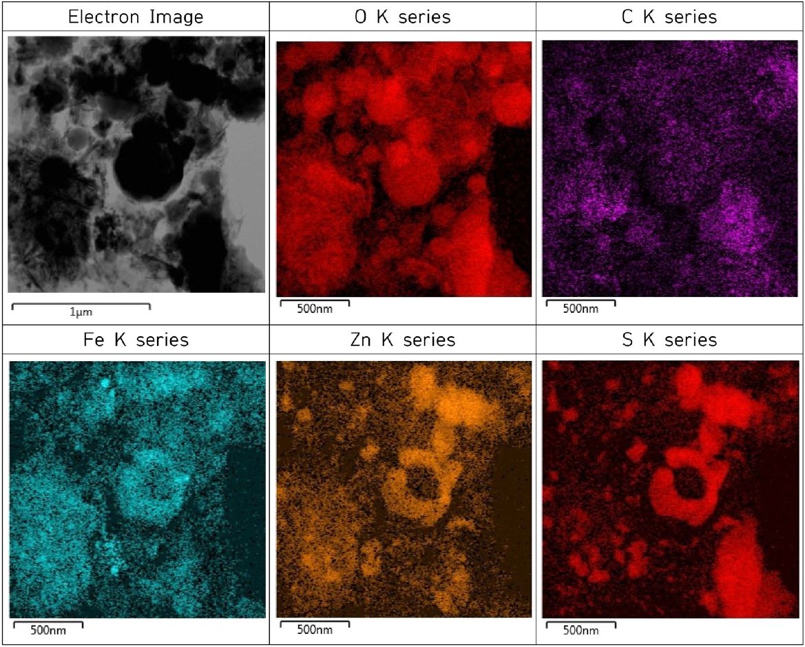 분석 결과를 나타내었다. 그림에서 볼 수 있듯이 C, Fe, Zn 등의 성분들이 1 μm 이하의 미립자로 분포하였으며, C의 경우에는 단일 입자로 존재하였다. Fe와 Zn는 각각 Fe2O3, ZnS로 존재하는 것을 알 수 있으며 이는 그림 2의 XRD에서 관찰된 상과 일치하였다. 그리고 유가 물질인 Zn, Fe, C 등은 응집되어 있으므로 이들을 분리하여 회수하기 위해서는 슬러지의 분산이