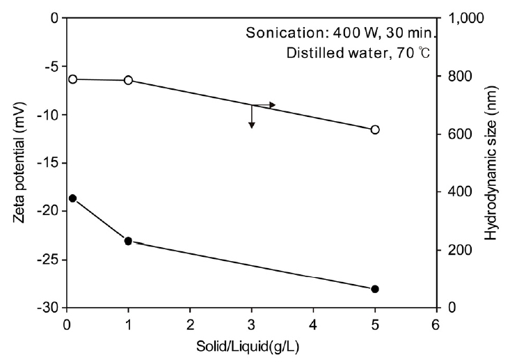 그림 5에 고로 슬러지 입자를 증류수 중에 분산시킨 경우의 고액비(g/L)에 따른 zeta potential과 hydrodynamic size의 변화를 나타내었다.