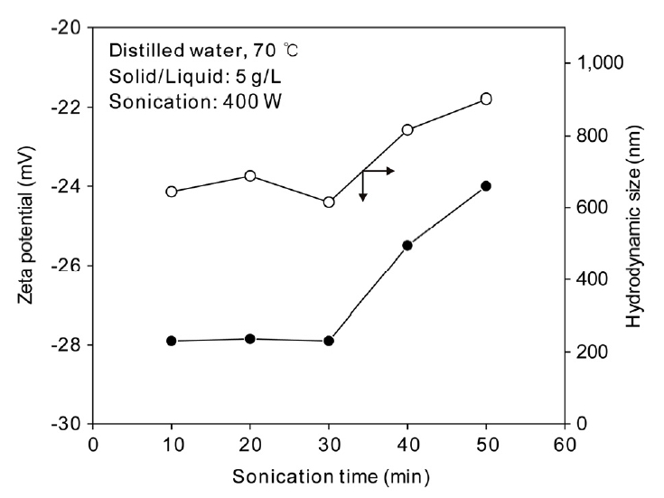 그림 7에는 초음파 분산 시간에 따른 zeta potential과 hydrodynamic size의 변화를 나타내었다. 10분에서 30분까지 초음파 분산