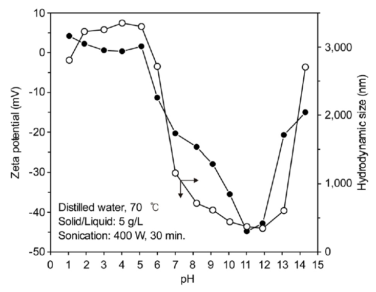한편 pH가 11 이상으로 증가하면 오히려 zeta potential과, hydrodynamic size가 증가하였다. 이러한 결과는 pH 조정을