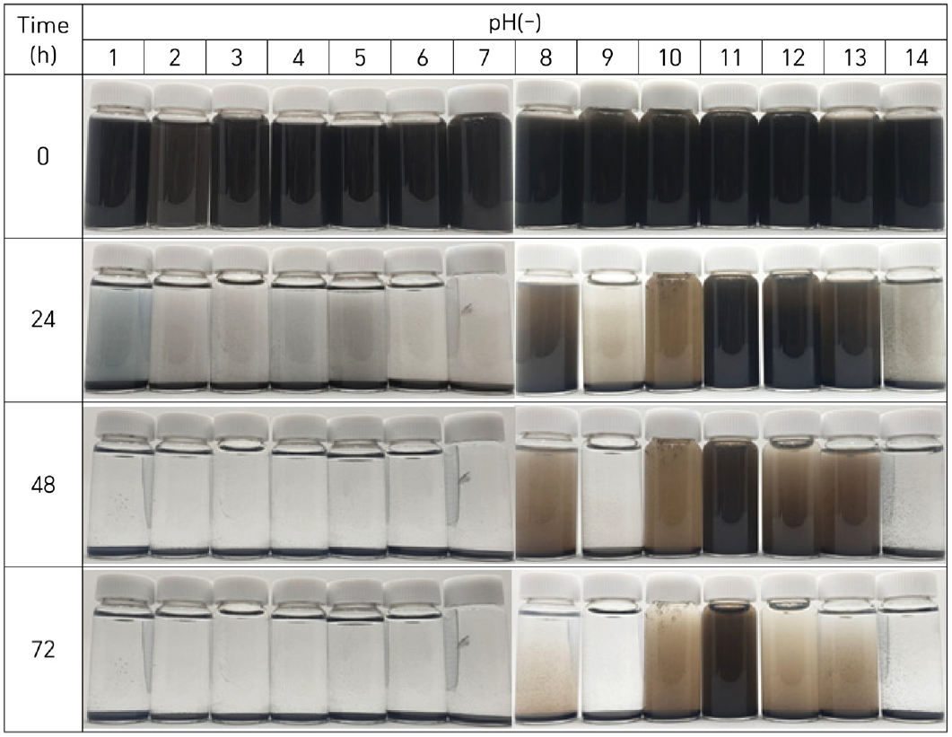 그림 9에는 pH 변화에 따른 고로 슬러지의 분산거동을 24 시간 간격으로 관찰한 결과를 나타내었다. 그림 8에 나타난 바와 같이 pH=11에서는 72 시간이 지나도 슬러지입자가 응집되지 않고 초기와 유사하게 용액 속에 현탁되어 있는 모습이 관찰되었다. 그러나