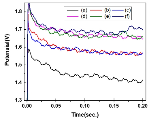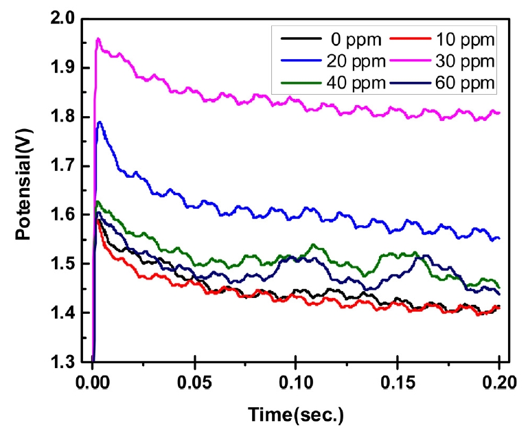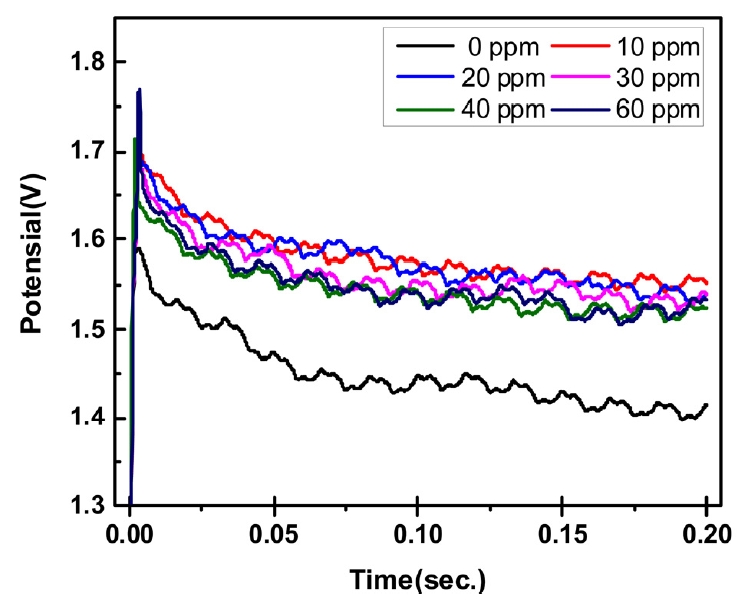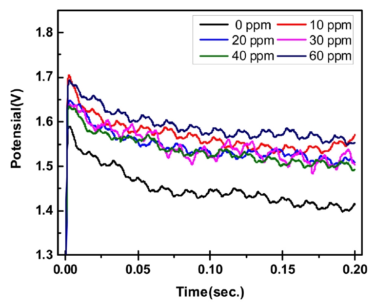MPSA์ฒจ๊ฐ์ ์ ์ฒจ๊ฐ๋์ ๋ฌ๋ฆฌํ์ฌ ์ฒจ๊ฐํ์ฌ 0.2์ด ๋๊ธ์๊ฐ๋์์ ์ ์์ ๋ณํ๋ฅผ ๊ทธ๋ฆผ 4์ ๋ํ๋ด์๋ค. MPSA์ฒจ๊ฐ์ ๋ฅผ ์ฒจ๊ฐํ ๊ฒฝ์ฐ ๋ฌด์ฒจ๊ตฐ ๋๋น ์ ๋ฐ์ ์ผ๋ก ์ ์์ด ๋๊ฒ ํ์ฑ๋์๊ณ MPSA์ฒจ๊ฐ๋๋ณ๋ก ์ดํด๋ณด๋ฉด, 10 ppm ์ฒจ๊ฐ ์ ๋๊ฒ