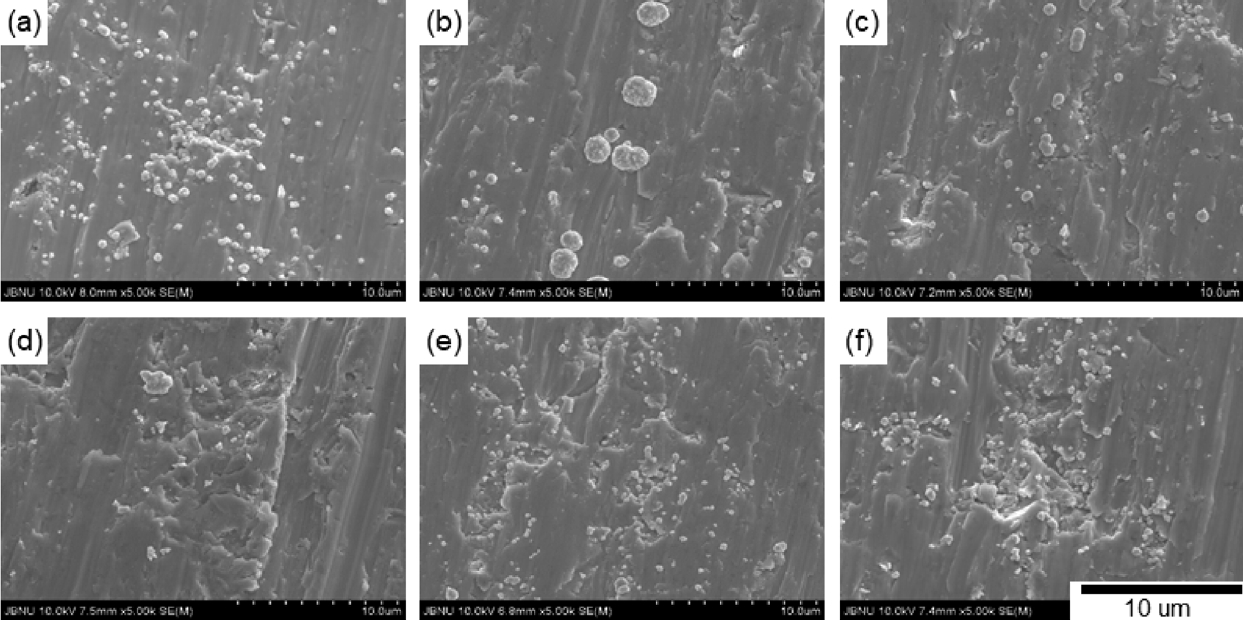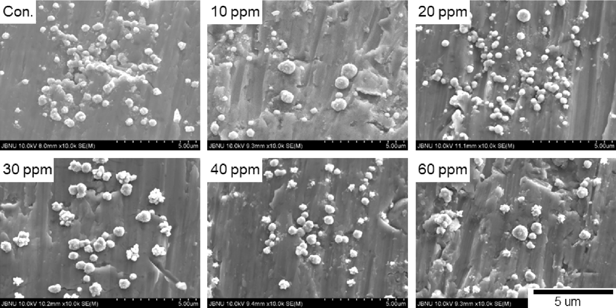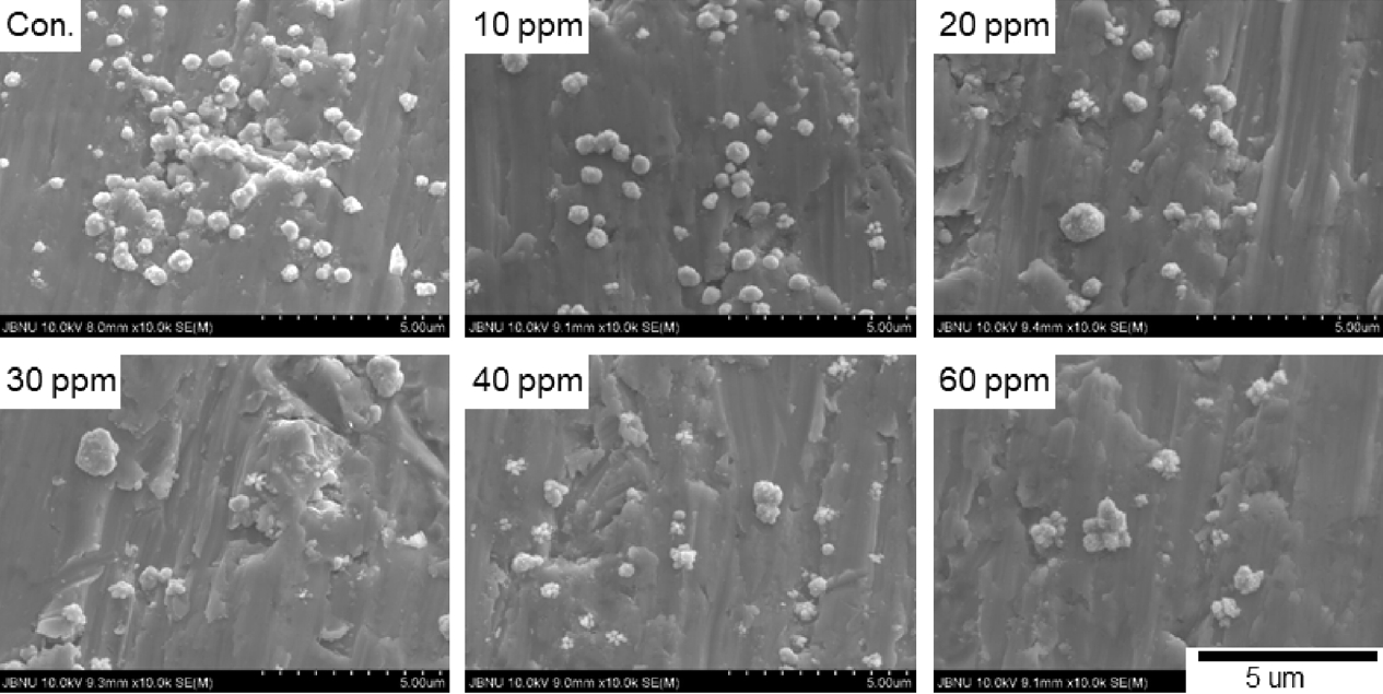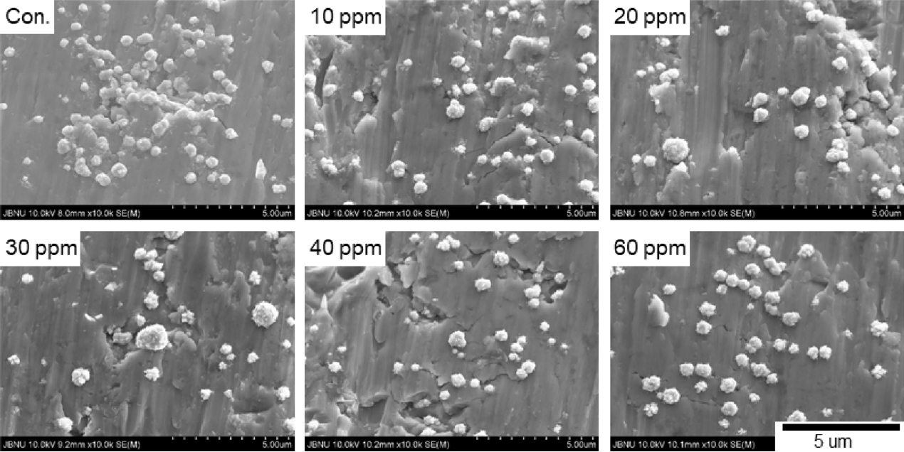 ๋์ ์กฐ๊ฑด(30 ppm)์์ ๊ฒฐ์ ๋ค์ด ์์ง๋๋ ํ์์ ๊ด์ฐฐ ํ ์ ์๋ค(๊ทธ๋ฆผ 9). ๋ํ ํฐ ๊ฒฐ์ ์ ํ๋ฉด์์ ๋ค์์ ๋ฏธ์ธ ๊ฒฐ์ ๋ค์ด ์์ฑ๋๊ณ ์ฑ์ฅ์ด ์ด๋ฃจ์ด์ง๊ณ ์๋ค. ๊ฐ๋ณ์ ์ผ๋ก ์ฒจ๊ฐ์ ๋ฅผ ์ฒจ๊ฐํ ๊ฒฝ์ฐ ์ฒจ๊ฐ์ ์ข