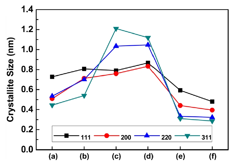 ๊ฒฐ์ ๋ฐฉ์๋ณ ๊ฐ์ฅ ํฐ ๊ฒฐ์ ๋ฆฝ ํฌ๊ธฐ๋ฅผ ๋ณด์ด๊ณ ์์ผ๋ฉฐ, ๋ฌด์ฒจ๊ฐ (a)๊ตฐ ๋๋น (111)๋ฐฉ์๋ 8.5%, (311)๋ฐฉ์๋ 172% ๊ฒฐ์ ๋ฆฝ ํฌ๊ธฐ ์ฆ๊ฐ๊ฐ ์์๋ค.