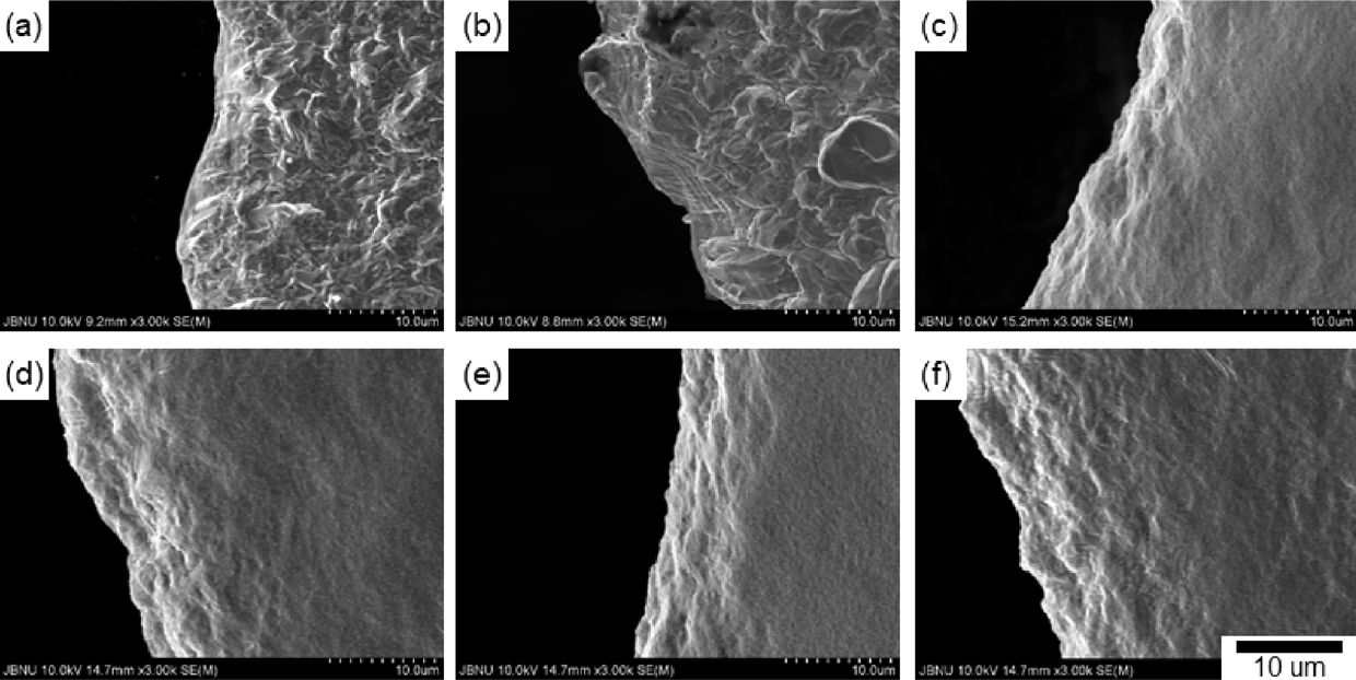 ํ๋จ๋ฉด์ด ๊ด์ฐฐ๋์๋ค. ๋ํ ์ต์ ์ ๋ฅผ ์ฒจ๊ฐํ (c), (d) ์กฐ๊ฑด์์๋ shear-lip์ ํ์์ด ๋ณด์ด๋, ํํ์ ๋ฅผ ์ฒจ๊ฐํ ์กฐ๊ฑด์์๋ ์ด๋ฌํ ํ๋จ๋ฉด์ด