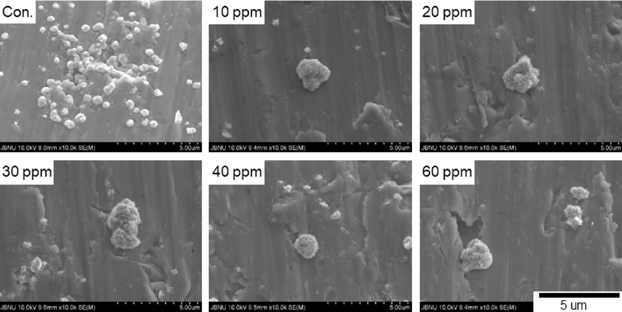 ๊ทธ๋ฆผ 2๋ ์ผํ์ด์จ์ ์ฒจ๊ฐ๋์ ๋ฌ๋ฆฌํ์ฌ 0.2์ด ๋์ ๋๊ธํ ํ๋ฉด์ ๊ด์ฐฐํ ๊ฒฐ๊ณผ์ด๋ค. ์๋ฌด๋ฐ ์ฒจ๊ฐ์ ๋ฅผ ์ถ๊ฐํ์ง ์์ ๋ฌด์ฒ๋ฆฌ ๊ตฐ์ ๊ฒฝ์ฐ 1 ฮผm ์ดํ์ ๊ตฌํ