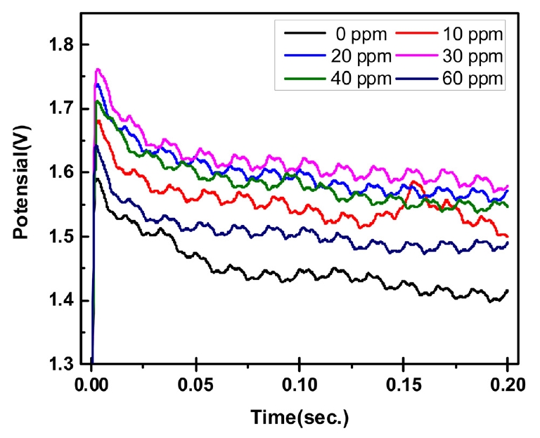 ํ์ฑ๋๋ ์ ์์ด ์ฒจ๊ฐ๋์ด 40 ppm๊น์ง ์์ํ ๊ฐ์ํ๋ค 60 ppm์ ๊ฒฝ์ฐ์๋ 10 ppm๋ณด๋ค ๋์ ์ ์์ ๋ณด์ด๊ณ ์๋ค. ๊ทธ๋ฌ๋ MPSA 60 ppm์