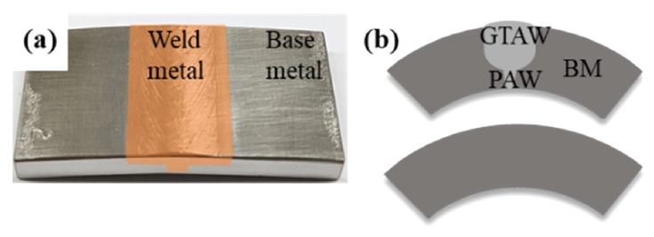 kJ/cm)를 수행한 2 pass로 수행하였으며, GTAW에 국한하여 Inconel 625 용접재료가 사용되었다. 그림 1(a)는 실제 combined 용접 후 시편 형상을 보여주며, 그림 1(b)는 파이프 시편 단면부의 모식도로 용접부 및 모재 영역의 개괄적 형상을 나타낸다. 용접 후 열처리의 경우, 선행문헌 [32]을 토대로 동일 소재 내 효과적인 이차상의 제거를 위해 1050~1150 °C의 온도범위를 선정하여 10분간 유지 후 급냉하는 방식을 채택하였다.