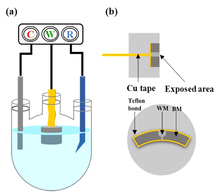 Schematic diagram of (a) electrochemical corrosion test cell and (b) specimen preparation