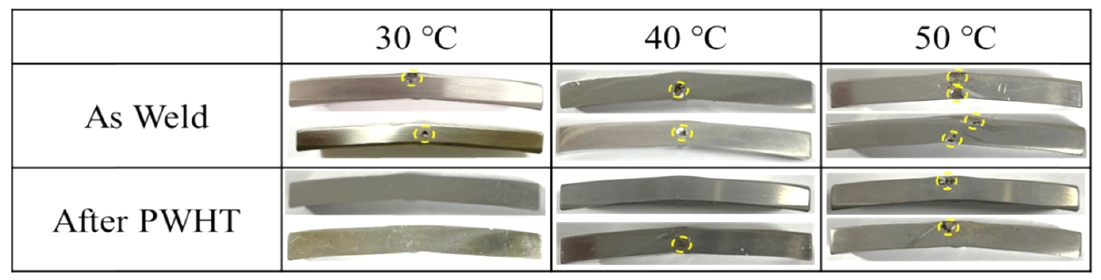 용접부 내 공식이 발생된 반면, 후 열처리를 수행한 시편의 경우 30 °C의 온도에서 공식이 관찰되지 않았다. 또한, 40 °C의 온도에서는 일부