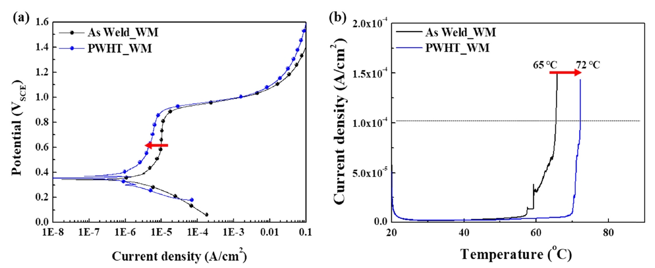 (a) Potentiodynamic polarization curves of the base metal before and after PWHT, evaluated