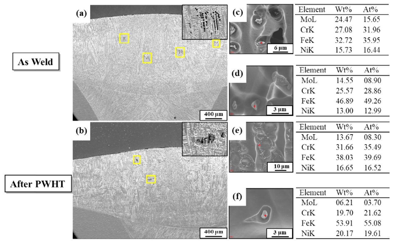 ((e) and (f)) morphology observation and EDS analyses of the σ phase found in GTAW