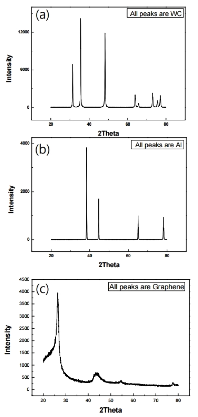 그림 1은 초기 분말의 텅스텐 카바이드, 그래핀, 알루미늄 X-선 회절 도형을 나타낸 것이고, 초기 분말들의 미세조직은 그림 2에 나타냈다. 텅스텐 카바이드와 알루미늄 분말은 둥근 형태를 나타내고 있고 그래핀은 판상의 형태를 나타내고 있다. 밀링한 분말 X-선 회절 패턴은