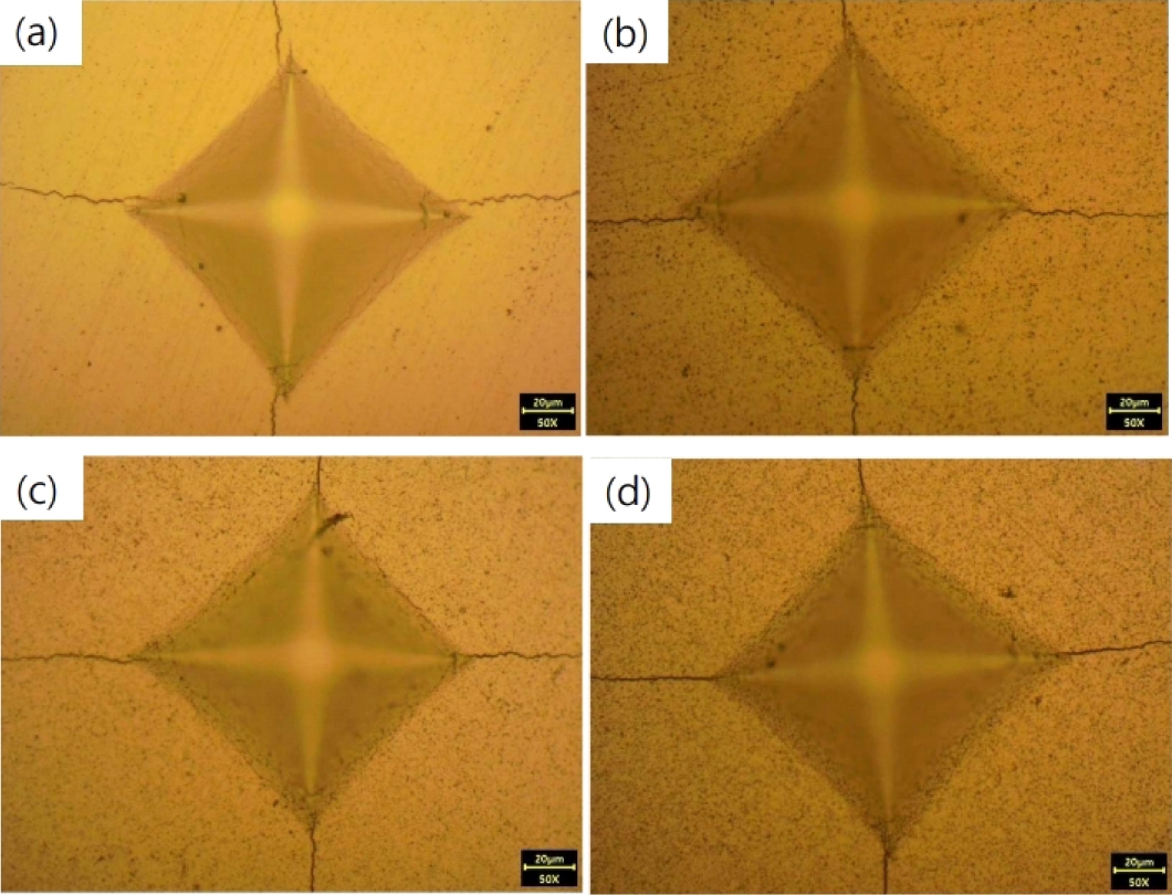 그림 10은 압흔 자국을 나타낸 것이고, 압흔 모서리에서 균열이 전파되고 있는 것을 관찰할 수 있다. 파괴 인성은 압흔 자국의 중심에서의 전파된 균열 길이를