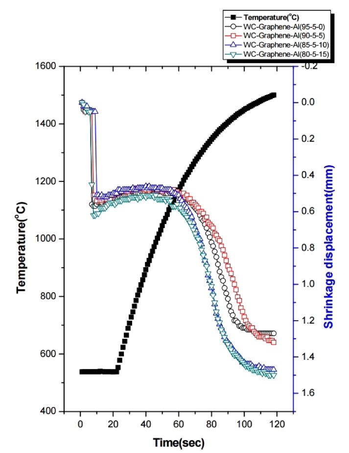 흑연 다이에 가하여 소결을 하였다. 소결은 수축 길이 변화가 완만할 때까지 진행하였다. 리니어 게이지로 시편의 수축 길이를 측정하였고, 광온도계로