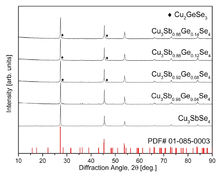 Figure 1 shows the XRD patterns of Cu3Sb1−yGeySe4 processed by MA-HP. The diffraction peaks matched the standard diffraction pattern