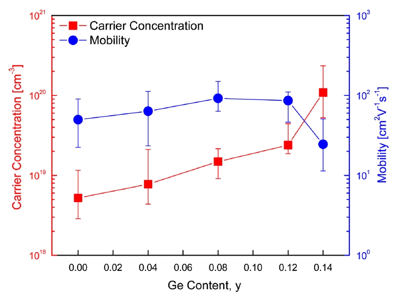 increased with increasing Ge content, although the mobility decreased when y > 0.08. This was because the Ge doping transforms the semiconducting state from nondegenerate
