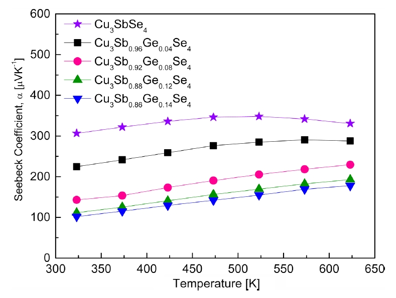 in nature. As the Ge content increased, the Seebeck coefficient decreased, while the