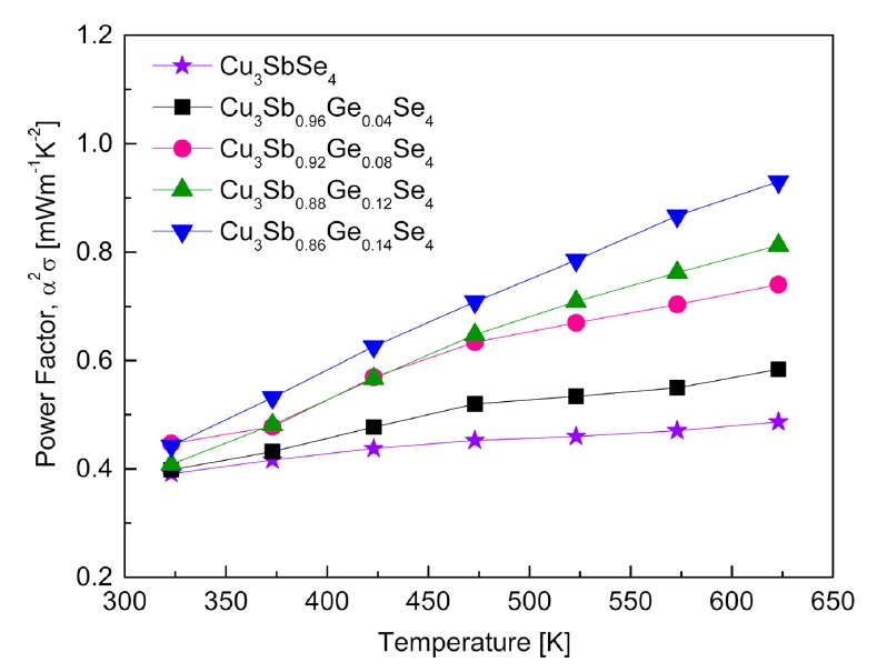 of the Seebeck coefficient and electrical conductivity. The power factor of Cu3SbSe4 was as low as 0.39–0.49 mW·m−1·K−2 at 323–623 K with a small temperature dependence. However, as the Ge content increased,