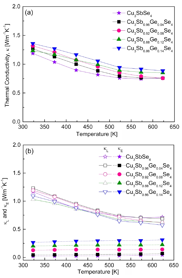 Figure 8 shows the thermal conductivity of the Cu3Sb1−yGeySe4. As shown in Fig 8(a), the thermal conductivity decreased with increasing temperature. The thermal conductivity