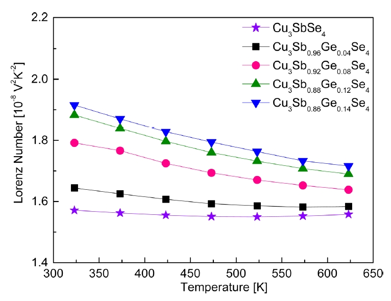 numbers of undoped Cu3SbSe4 were low and constant between 1.57 × 10−8 and 1.56 × 10−8 V2·K−2 at 323–623 K. However, the Lorenz number increased to (1.64–1.92) × 10−8 V2·K−22 at 323 K and (1.56–1.72) × 10−8 V2·K−2 at 623 K with increasing Ge content at constant temperature.