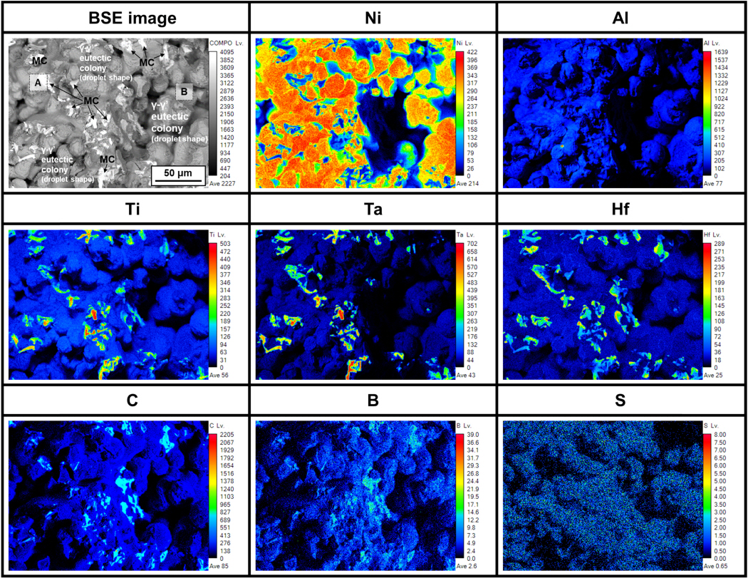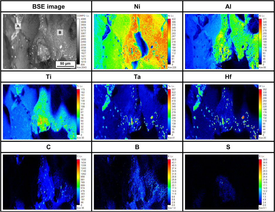 그림 8은 주조재 spot-Varestraint 시험부 액화균열 파면(그림 4 “A” 영역)을 EPMA로 분석한 결과이다. CM247LC 합금 터빈 블레이드 실 용접부의 액화균열 분석에 대한 본 저자의 선행 연구 결과에 따르면,