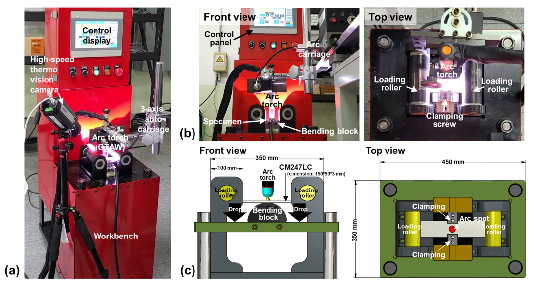 CM247LC 합금 용접부 고온균열 민감도를 정량 평가하기 위해 spot-Varestraint 시험을 실시하였다. 그림 2는 (a) 고속 열화상 카메라 관찰을 포함한 Varestraint 시험기 외관, (b)시험과정 및 (c)시험 모식도를 각각 나타낸다. 용접 조건 및