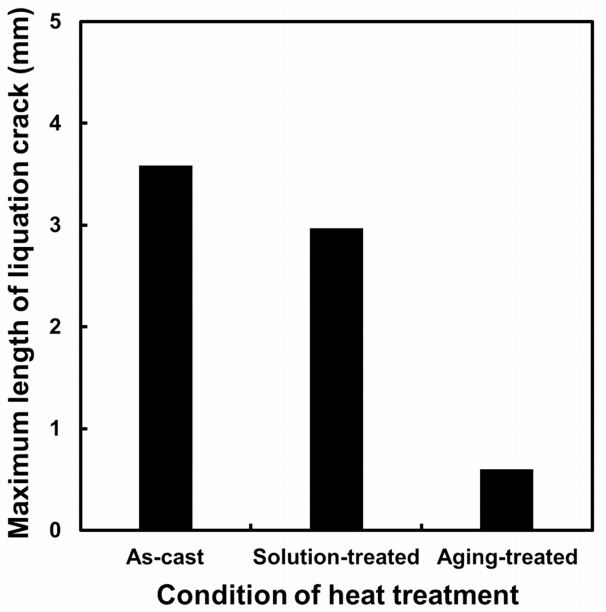 시험 시 각 소재에서 형성되는 최대 액화균열 길이는 굽힘 변형률 3% 조건에서 측정하였다. 그림 6은 열처리 조건에 따른 최대 균열길이(굽힘 변형률: 3%) 변화를 정리한 결과이다. 주조재의 최대 액화균열 길이는 3.58 mm, 용체화 열처리재