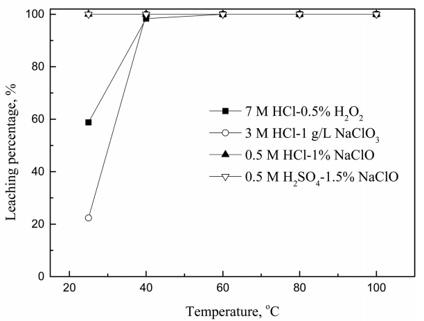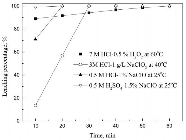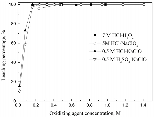 분말, 산화제의 순서로 첨가해 반응시간동안 침출했다. 산화제의 농도는 액체인 경우 %로, 고체 염소산나트륨은 g/L로 나타냈다. 침출이 끝난 뒤 침출용액을