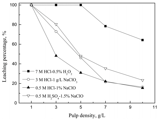 황산농도가 0.5 M로 산의 농도가 비교적 낮은 조건에서는 광액농도가 1에서 10 g/L로 증가함에 따라 팔라듐의 침출률이 급격히 감소했다. 이는
