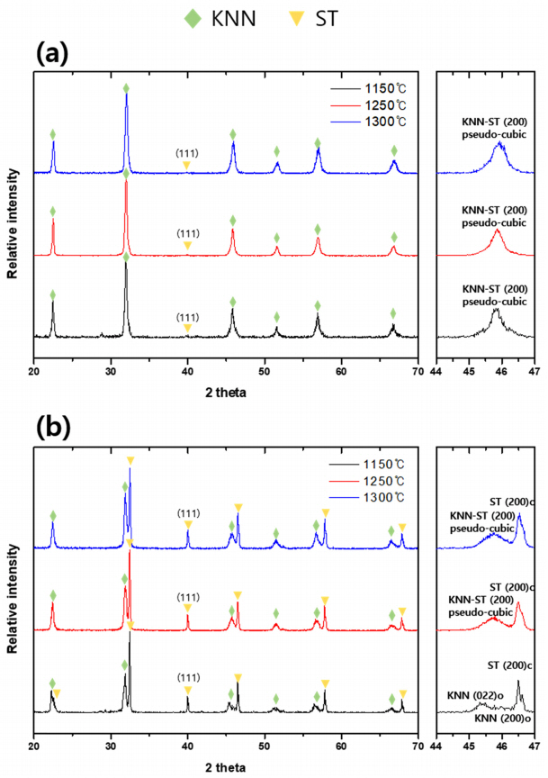 ST의 peak이 1250 °C와 1300 °C로 소결온도를 증가시켰을 때 KNN의 격자 내에 ST가 일부 고용되면서 KNN-ST pseudo-cubic