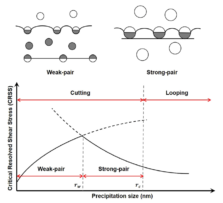 우회 현상이 일어난다. rc는 강 쌍 전위 관계에서 Orowan 우회로 전환되는 임계 석출물 크기이며, 석출물의 크기가 rw와 rc 사이의 크기일 때 강 쌍 전위 관계의 지배를 받는다. 약 쌍 전위 관계일 때 CRSS의 크기는 아래의 식 (2)과 같다 [22, 25-27].