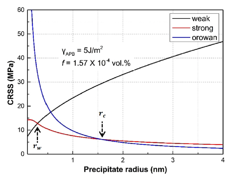 γAPB는 APB 에너지이며, b는 버거스벡터의 크기(b = 0.284 nm), f는 석출물 부피 분율, r은 석출물 반지름, T는 전위의 선 장력으로 T2 = Gb2/2로 나타내며 G는 전단 탄성 계수이다 (G = 26.2 GPa). 강 쌍 전위 관계일 때와 Orowan 우회 시 CRSS의 크기는 각각 아래의 식 (3)와 식 (4)로 나타낸다.