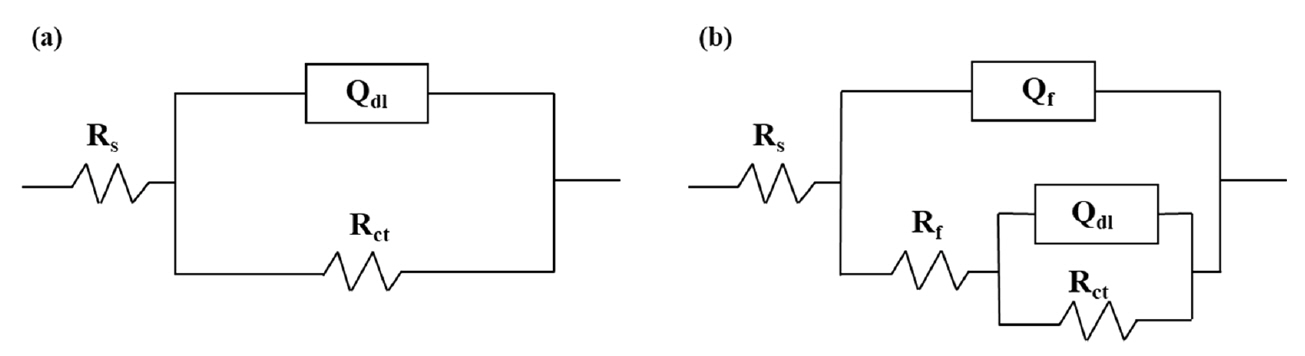 시간까지의 임피던스 분석은 그림 1(a)의 등가회로 모델을, 침지 24 시간 이후는 그림 1(b)의 등가회로 모델을 사용하였다. 그림에서, Rs, Qf, Rf, Qdl, Rct는 각각 용액 저항 (Ω·cm2), 부식생성물층의 커패시터 (F·cm-2), 부식생성물층의 저항 (Ω·cm2), 부식생성물/소지금속 계면의 커패시터 (F·cm-2), 부식생성물/소지 금속 계면에 대한 전하전달 저항 (Ω·cm2)을 의미한다. 실험 데이터의 재현성 확보를 위해 3번의 반복실험을 수행하여 대표성이 있는 데이터를 제시하였고 전체 실험에 대한 curve-fitting