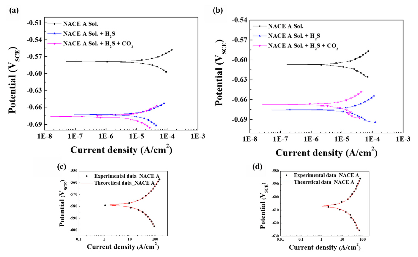 경우, 포화 칼로멜 전극(Saturated calomel electrode, SCE)을 사용하였다. NACE TM0284 [5]에 규정된 5% NaCl + 0.5% CH3COOH 용액(NACE A 용액)을 기반으로, 미량의 H2S 및 H2S와 CO2 복합환경 모사를 위해 각각 Na2S 단독첨가와 Na2S + CO2 가스 복합첨가 조건으로 실험용액을 설정하였으며 이를 표 2에 정리하였다. 즉, 실험실 내 H2S 유독성 가스의 직접 사용을 배제하고자 NACE A 용액 내 미량의 Na2S 첨가를 통해 H2S 부산물을 형성시켰다. 이에 대한 H2S 형성반응은 다음과 같다 [16,22]