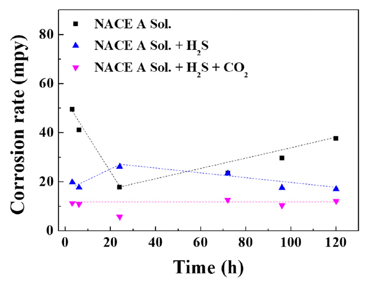 나타낸 것이다. 우선, 침지초기부터 후기에 이르기까지 NACE A 용액조건 대비 H2S 단독 및 H2S + CO2의 복합 첨가조건 하에서의 부식전위 값이 현저히 낮게 측정된 것이 확연한 차이로 나타났다. 이는 H2S 형성을 위해 공통으로 첨가된 Na2S에 의한 pH 상승 (식 (6)과 (7) [29])과 이로 인한 부식생성물의 안정적 형성에 기인한 음극환원반응의 저하로 설명될 수 있다.