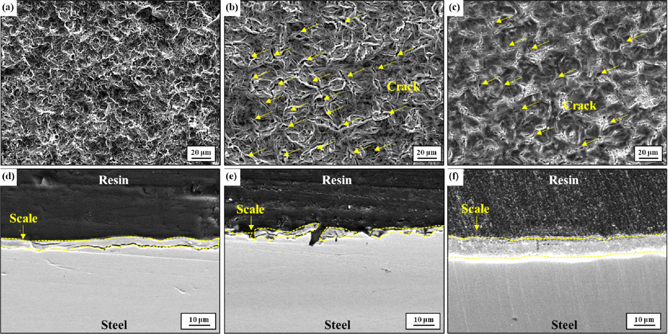 주의하여 세척 및 건조하였다. 부식생성물의 형상 관찰을 위해 FE-SEM을 활용하여 표면 및 단면 관찰을 수행하였다. 성분 분석을 위해 에너지 분산형