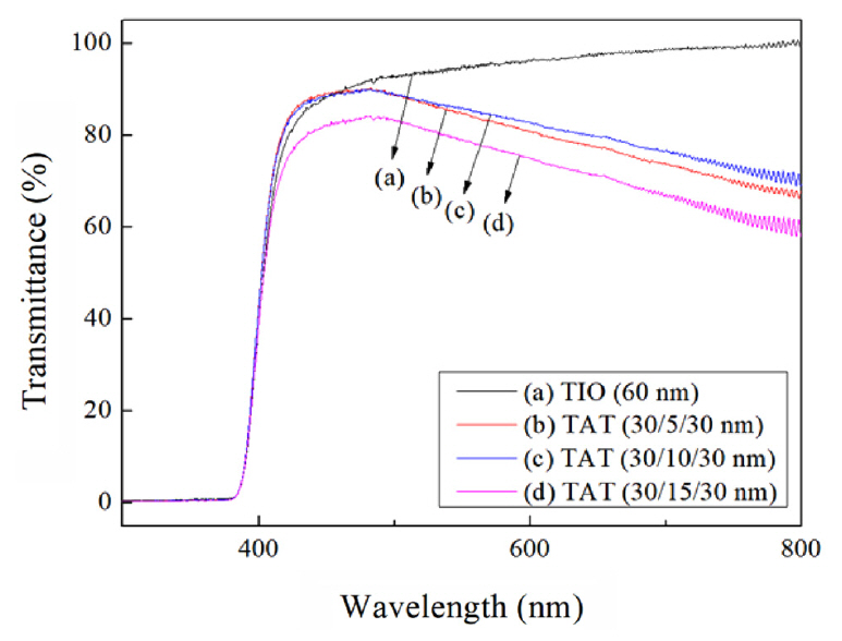 Ag 박막의 두께가 15 nm로 증가함에 따라 TAT 박막의 가시광 투과도는 74.05%로 감소하는 것을 확인할 수 있다. 이는 금속의 고유한 특성인
