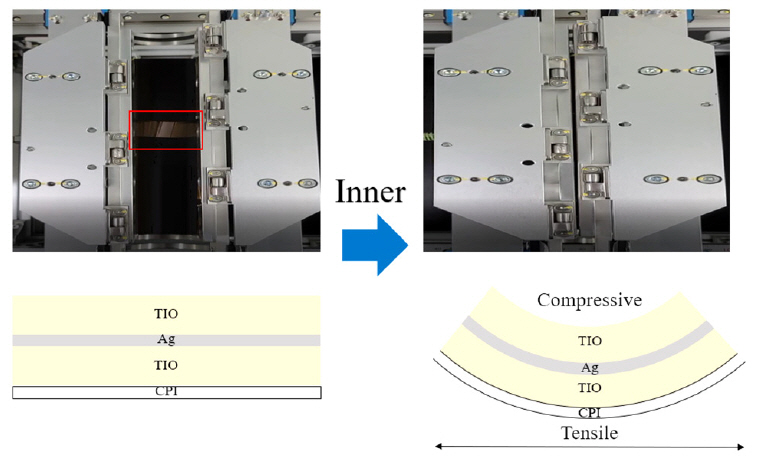 nm) 다층박막과 TIO(60 nm) 단층박막의 유연성을 측정하기 위하여 곡률반경을 5 부터 1.7 mm까지 줄여가며, Inner Type으로 굽힘실험을
