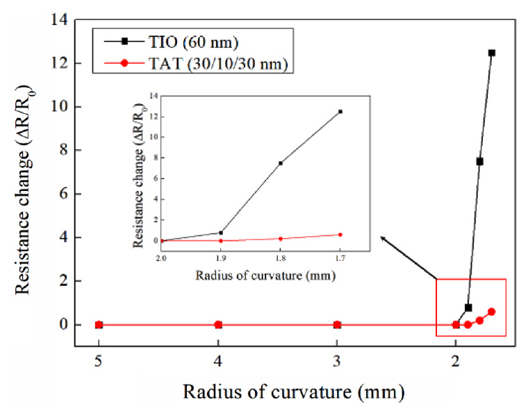 않았지만, 1.9 mm부터 TIO 단층박막의 저항변화가 확인되었다. TIO 단층박막은 곡률반경이 1.7 mm까지 줄어들 때 초기저항보다 최대 13배